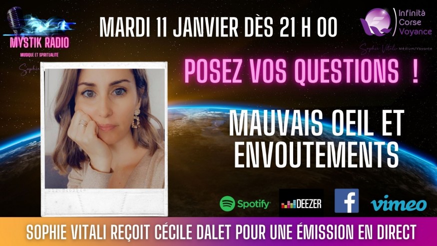 Le mardi 11 janvier dès 21 h 00, Cécile Dalet est l’invitée de Sophie Vitali pour une émission sur le mauvais œil et les envoûtements. Quels sont les causes et effets du mauvais œil ? Comment s'en préserver et comprendre les mécanismes, ce sont les sujets abordés pendant cette émission. Pour connaître la programmation des nouvelles émissions, visitez le site : www.infinita-corse-voyance.com